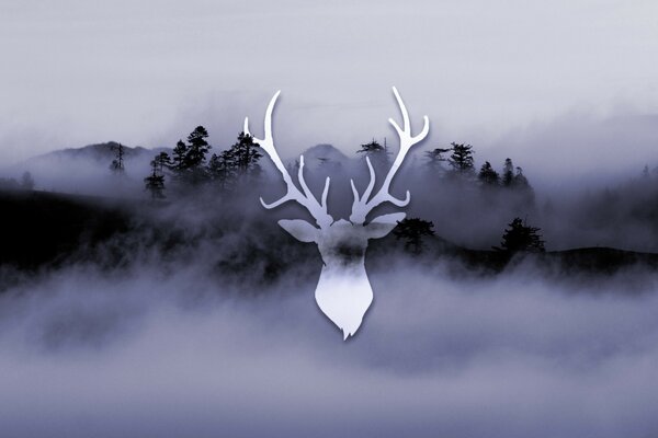 Herstellung eines hirsches vor dem hintergrund eines waldes im nebelHerstellung eines Hirsches vor dem Hintergrund eines Waldes im Nebel