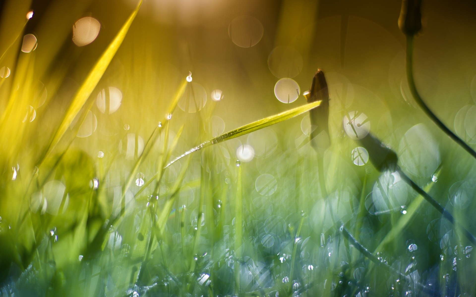 Schillernde Tautropfen auf dem Gras bei Tageslicht