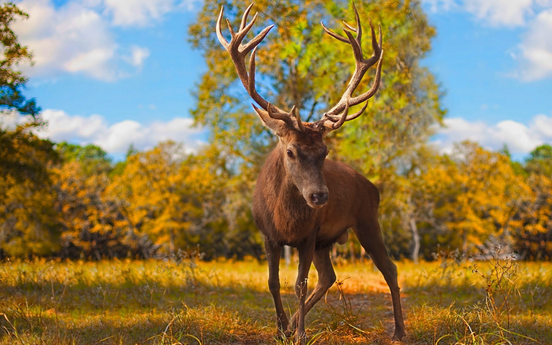Ein Reh geht im Wald auf dem Rasen spazieren