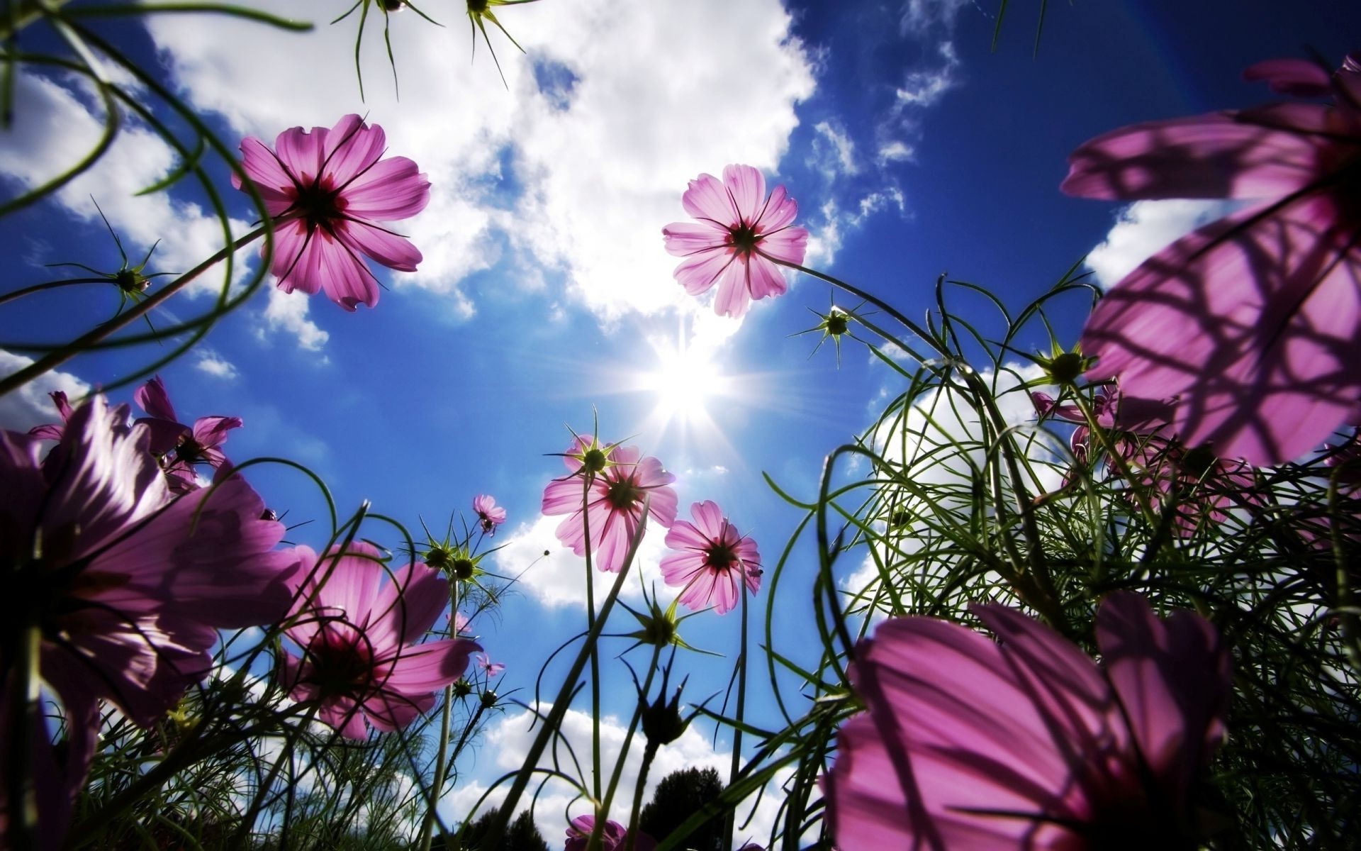 Lila Blumen auf Himmelshintergrund mit Wolken