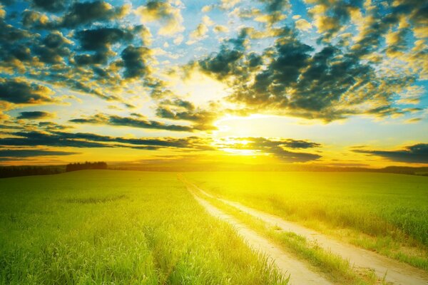Landstraße auf einem grünen Feld bei Sonnenuntergang