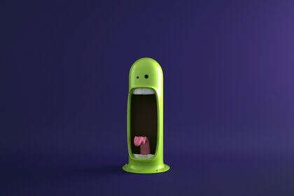 Die grüne monsterkapsel hat den mund geöffnet, so dass die zunge sichtbar istDie grüne Monsterkapsel hat den Mund geöffnet, so dass die Zunge sichtbar ist