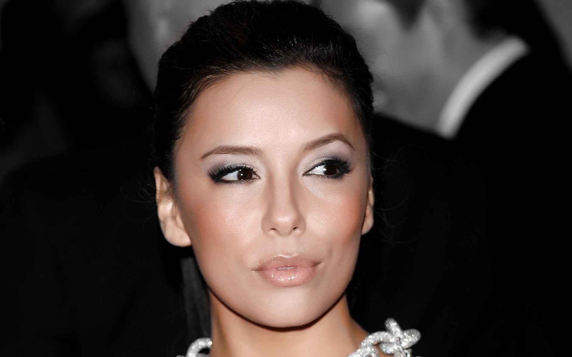 Eine frau mit einer halskette um den hals schaut zur seiteEine Frau mit einer Halskette um den Hals schaut zur Seite