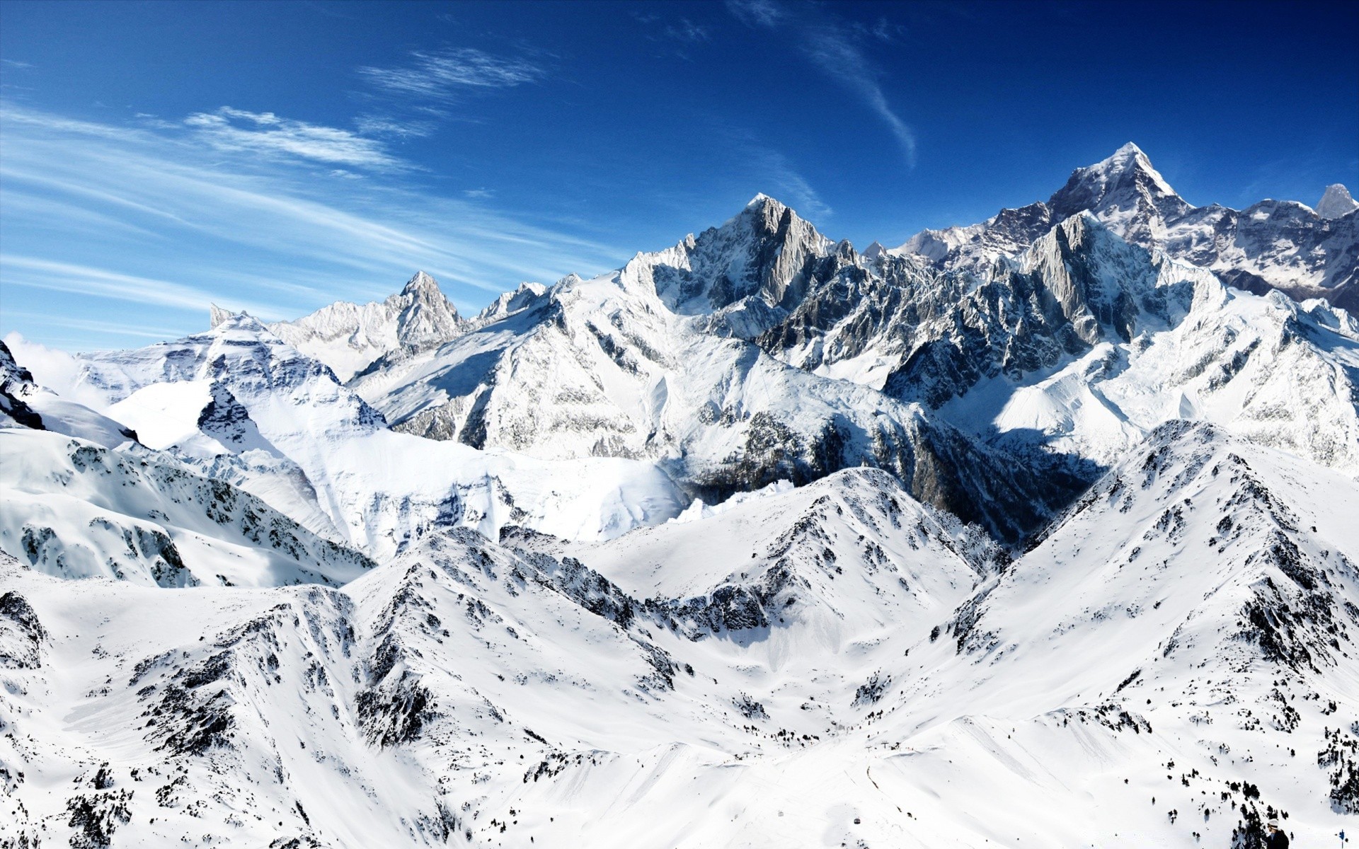 Schneebedeckte gipfel am blauen himmelshintergrundSchneebedeckte Gipfel am blauen Himmelshintergrund