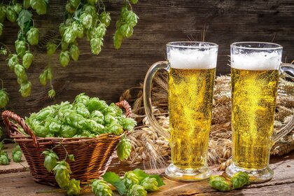 Becher Bier auf Hopfenhintergrund