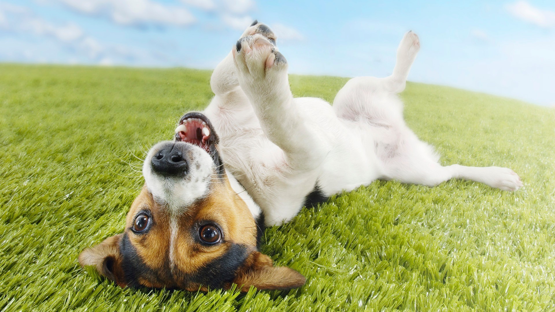 Ein einsamer Baum auf einer Wiese und ein Hund