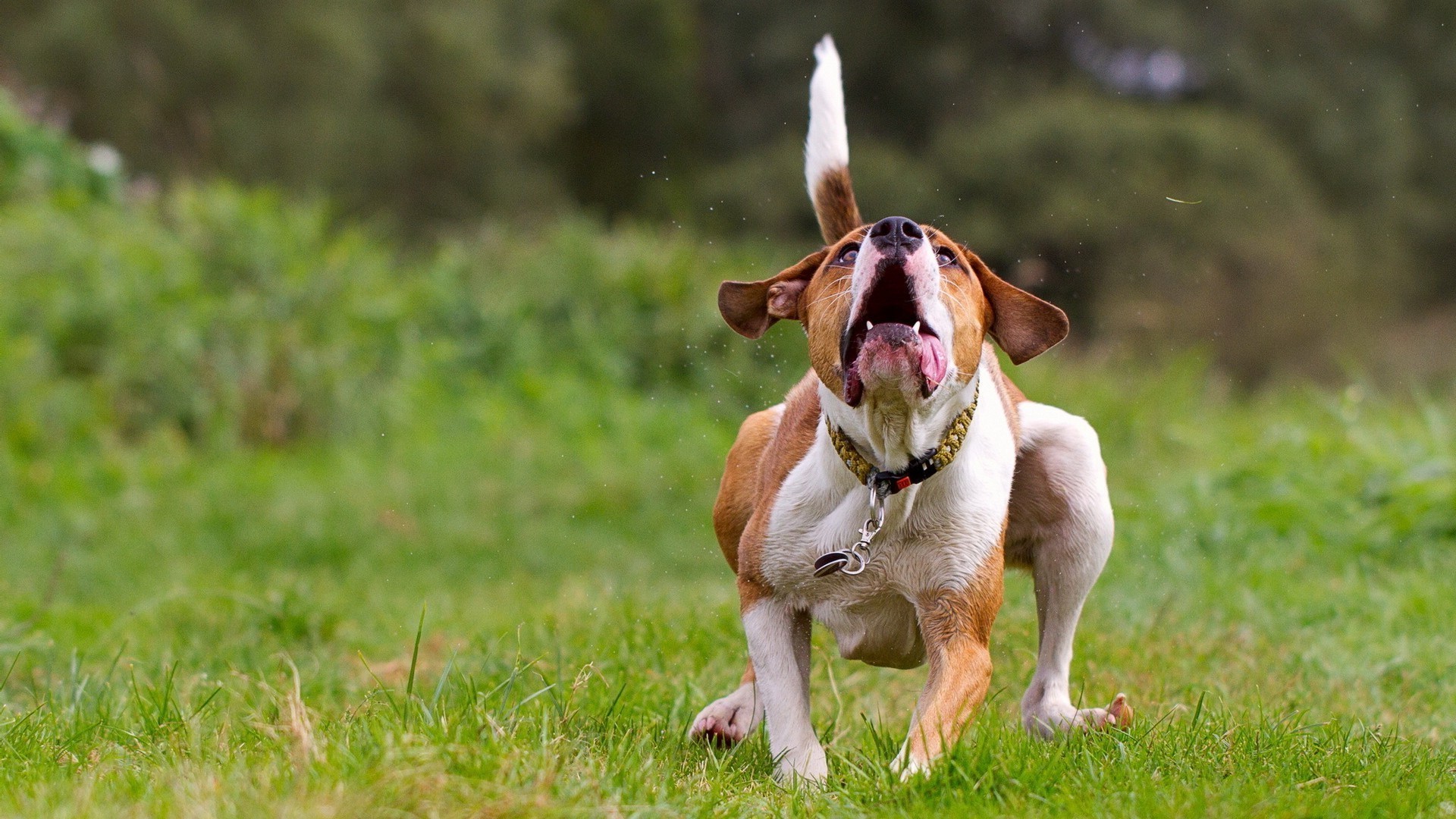 Brauner Hund mit ausgestreckter Zunge auf grünem Hintergrund