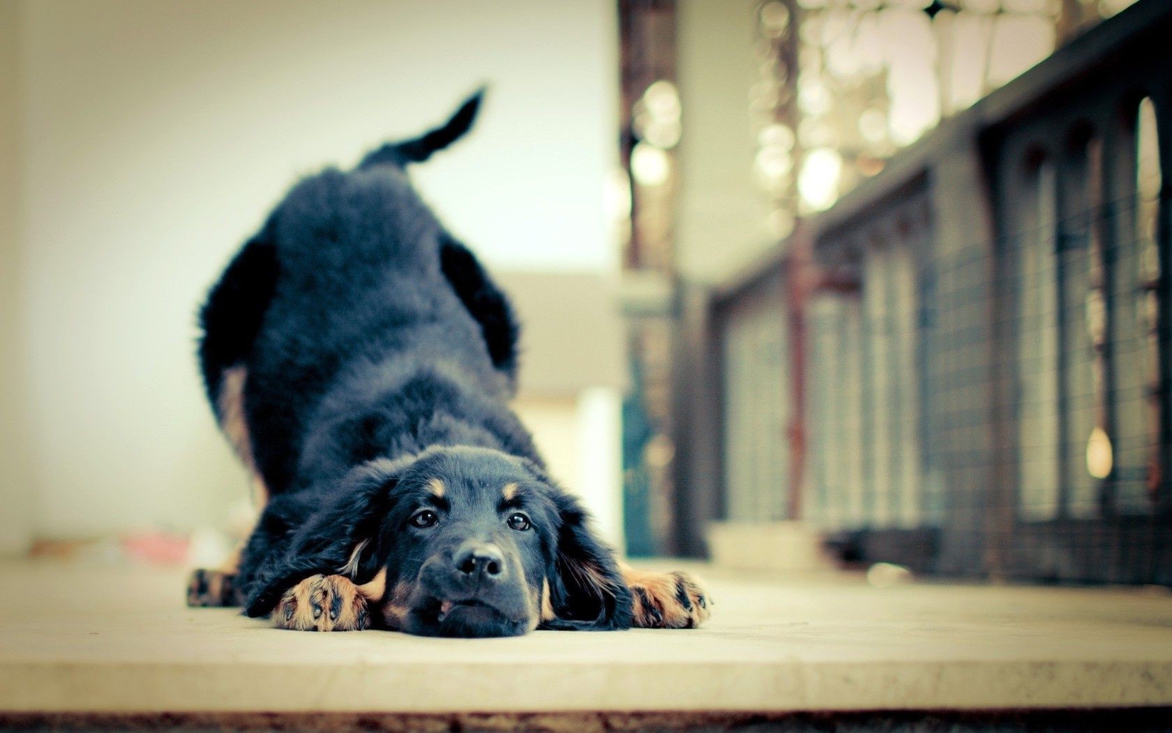 Ein zotteliger schwarzer hund auf einem hügel über der stadtEin zotteliger schwarzer Hund auf einem Hügel über der Stadt