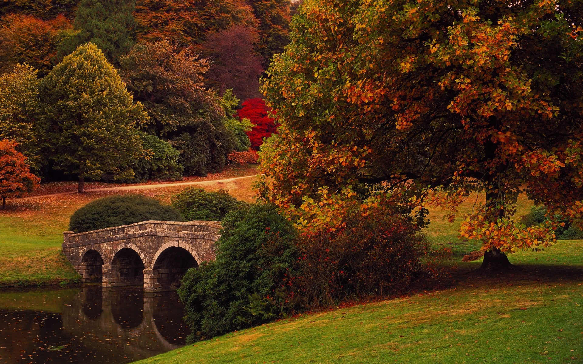 Alte Steinbrücke über den Fluss im europäischen Outback, herbstliche Landschaft