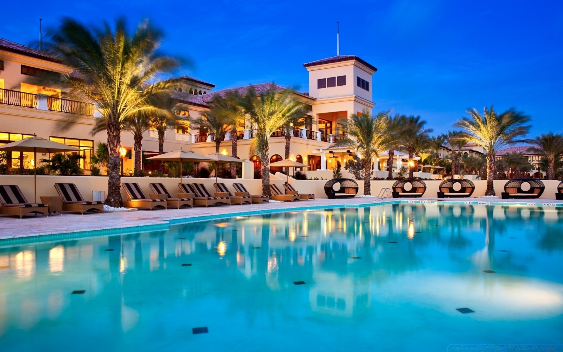 Ferienhaus mit Pool, umgeben von Palmen und Thuis