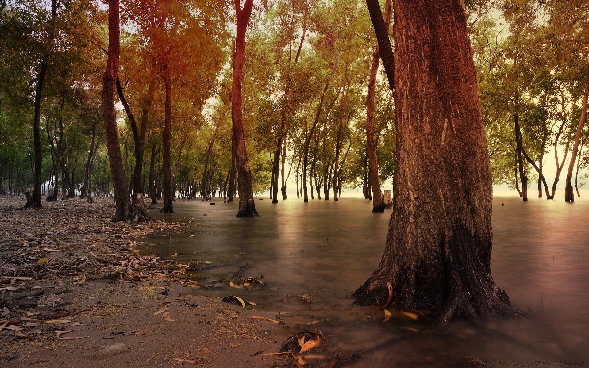 Herbstlandschaft im Wald mit riesigen Bäumen