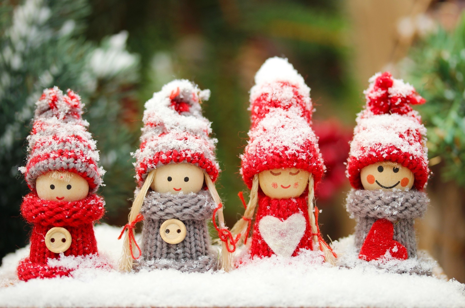 Weihnachtspuppen in Mützen im Schnee