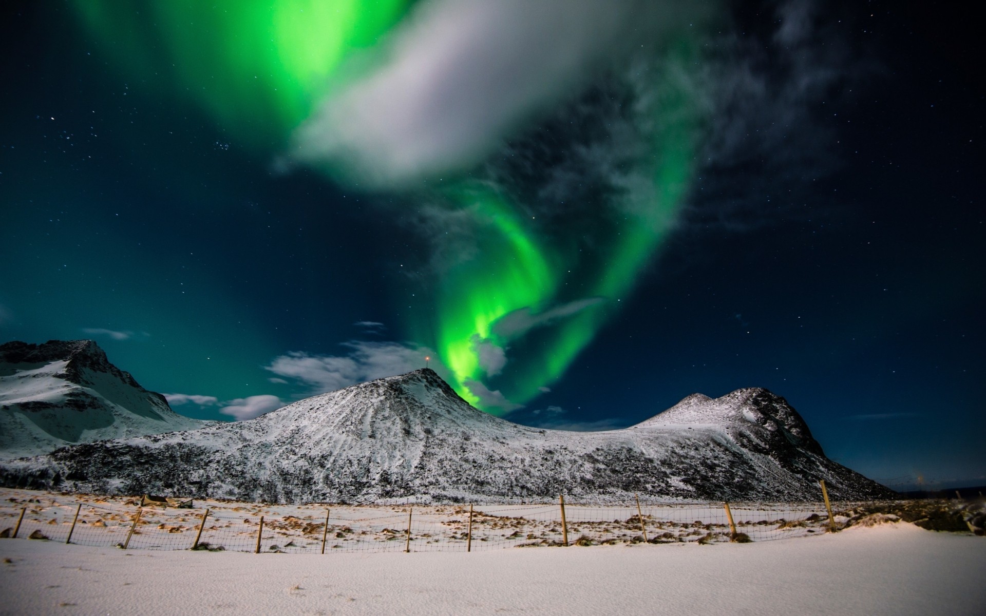 Grünes Leuchten am Himmel in der Nähe der Berge