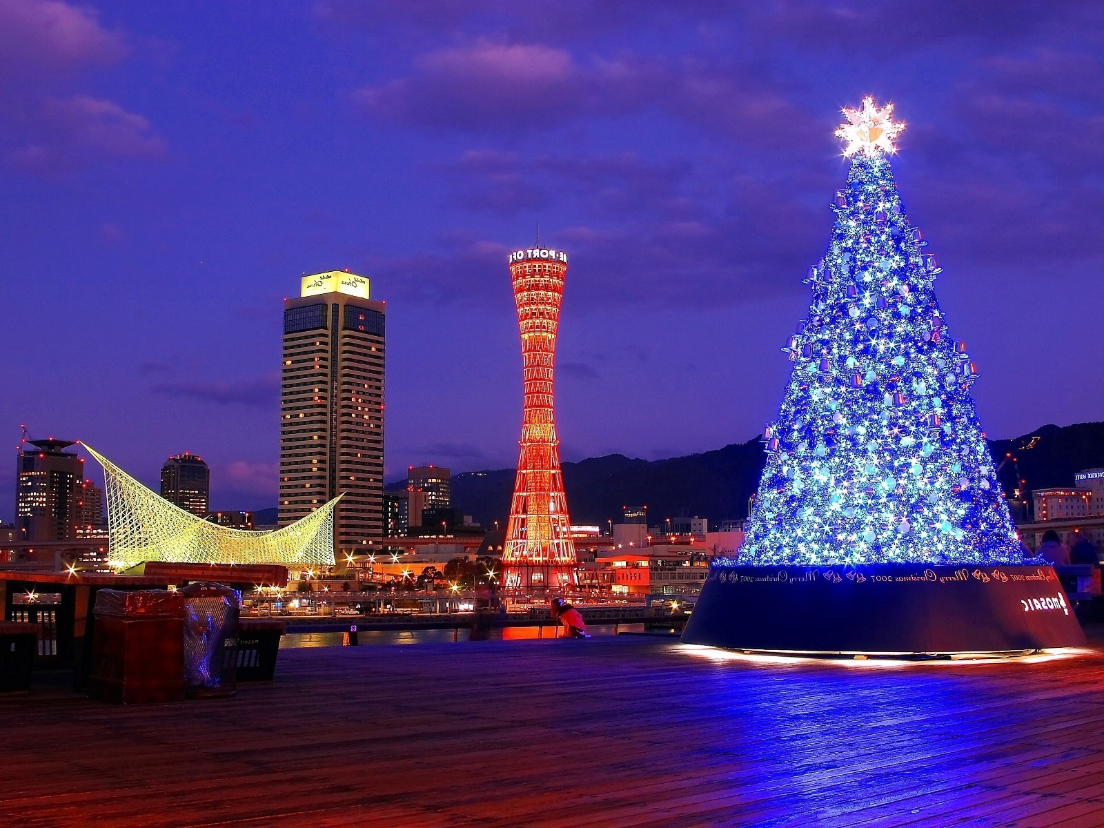 Blitze über Hochhäusern in der Stadt an der Brücke