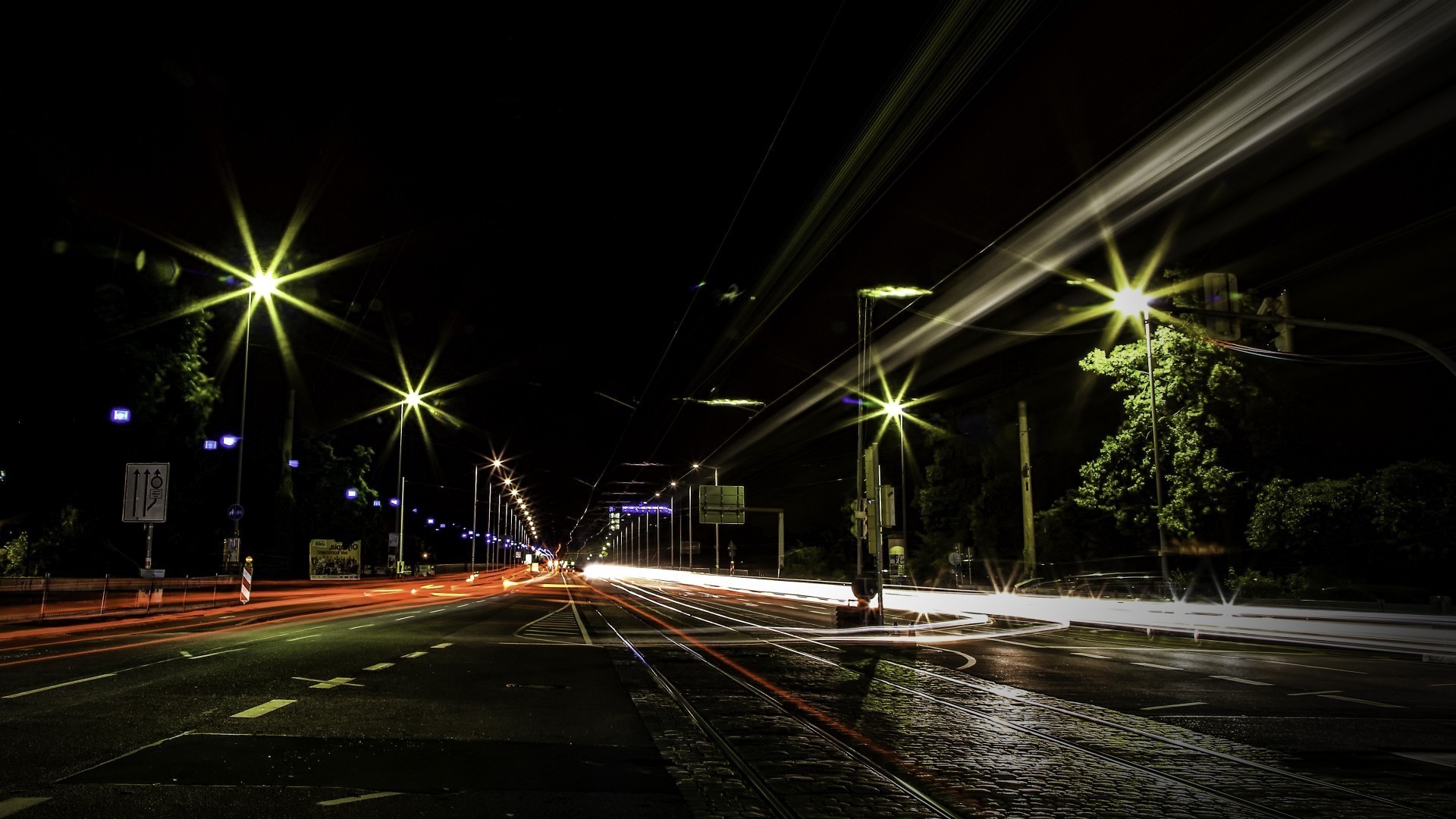 Nächtliche Stadt an einem belebten Fußgängerüberweg
