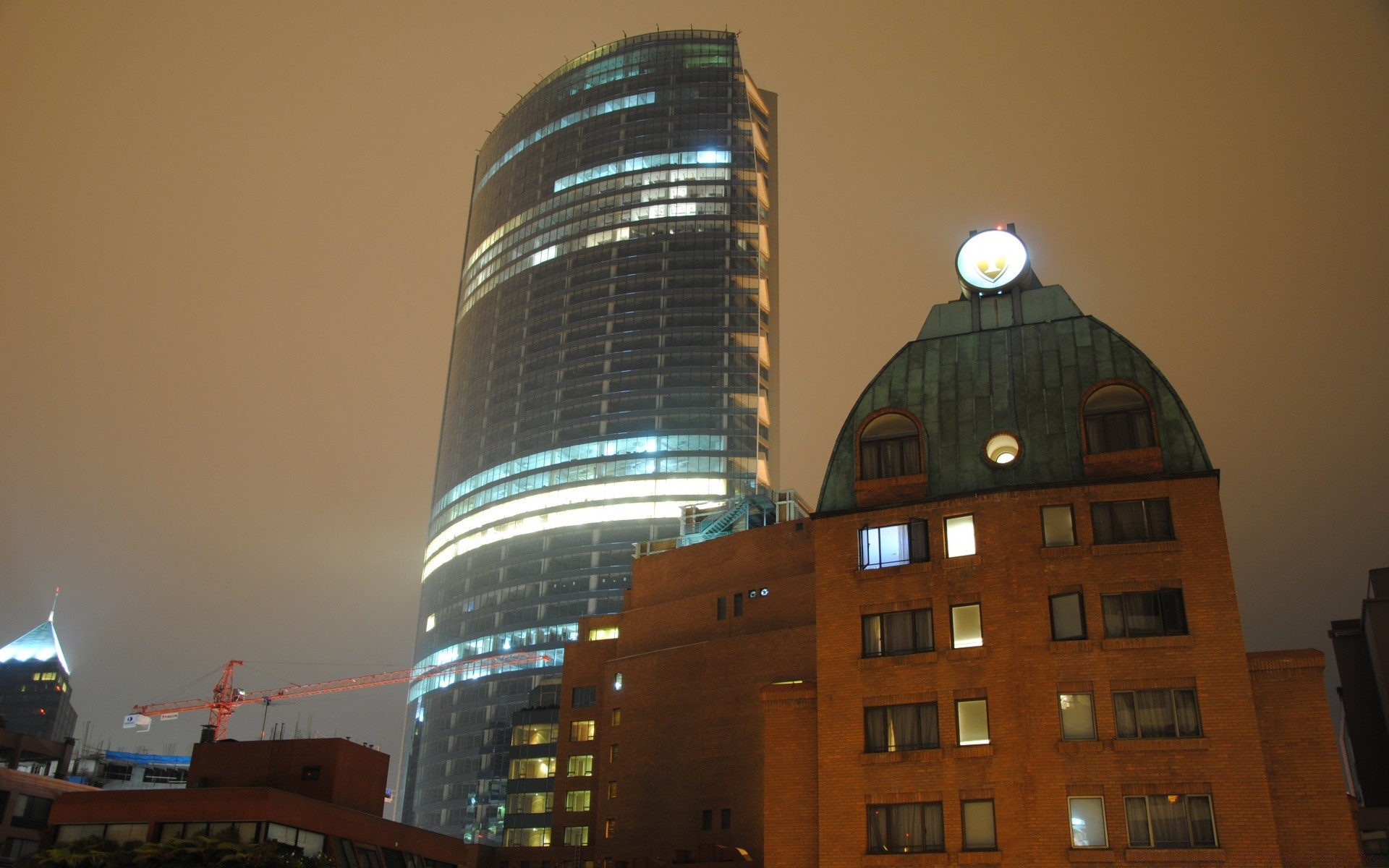 Ein Wolkenkratzer mit glatten Linien und ein Gebäude mit einem nicht standardmäßigen Dach