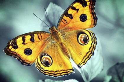 Foto eines blauen Schmetterlings auf Grün