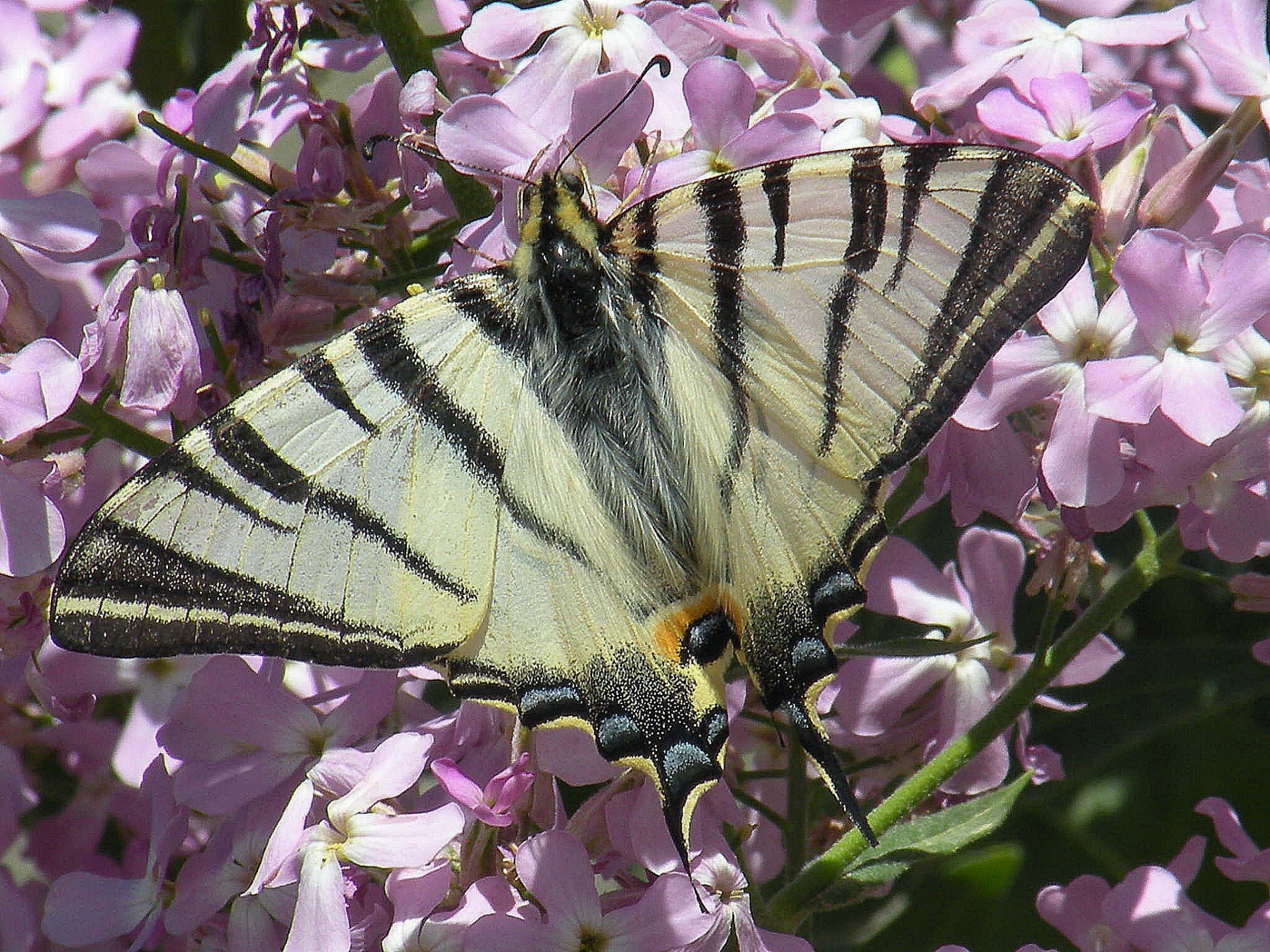 Schmetterling auf einer Blume. Rote Blumen. Dunkler Hintergrund