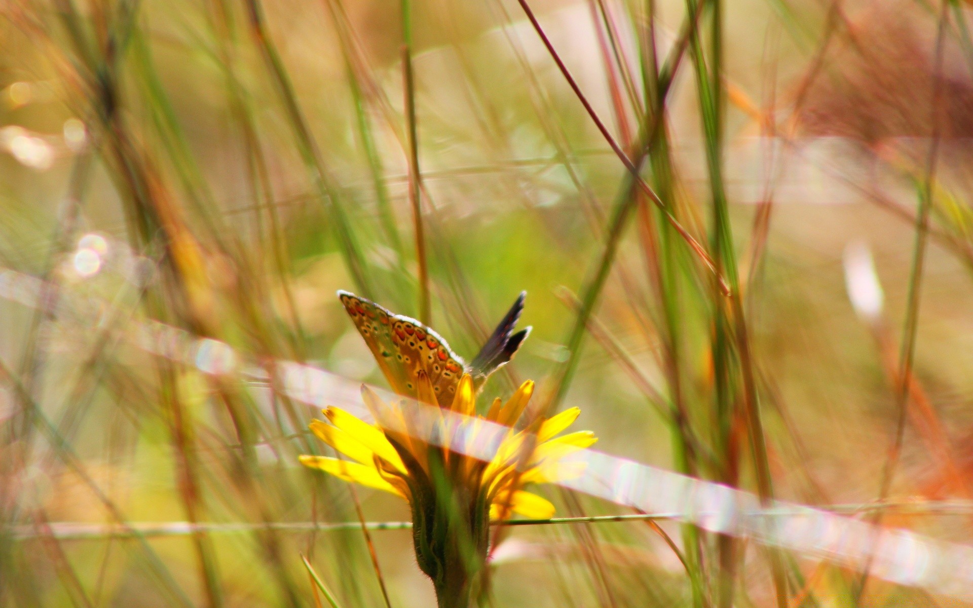 Grüne Wiese mit einem Schmetterling auf einem Ast