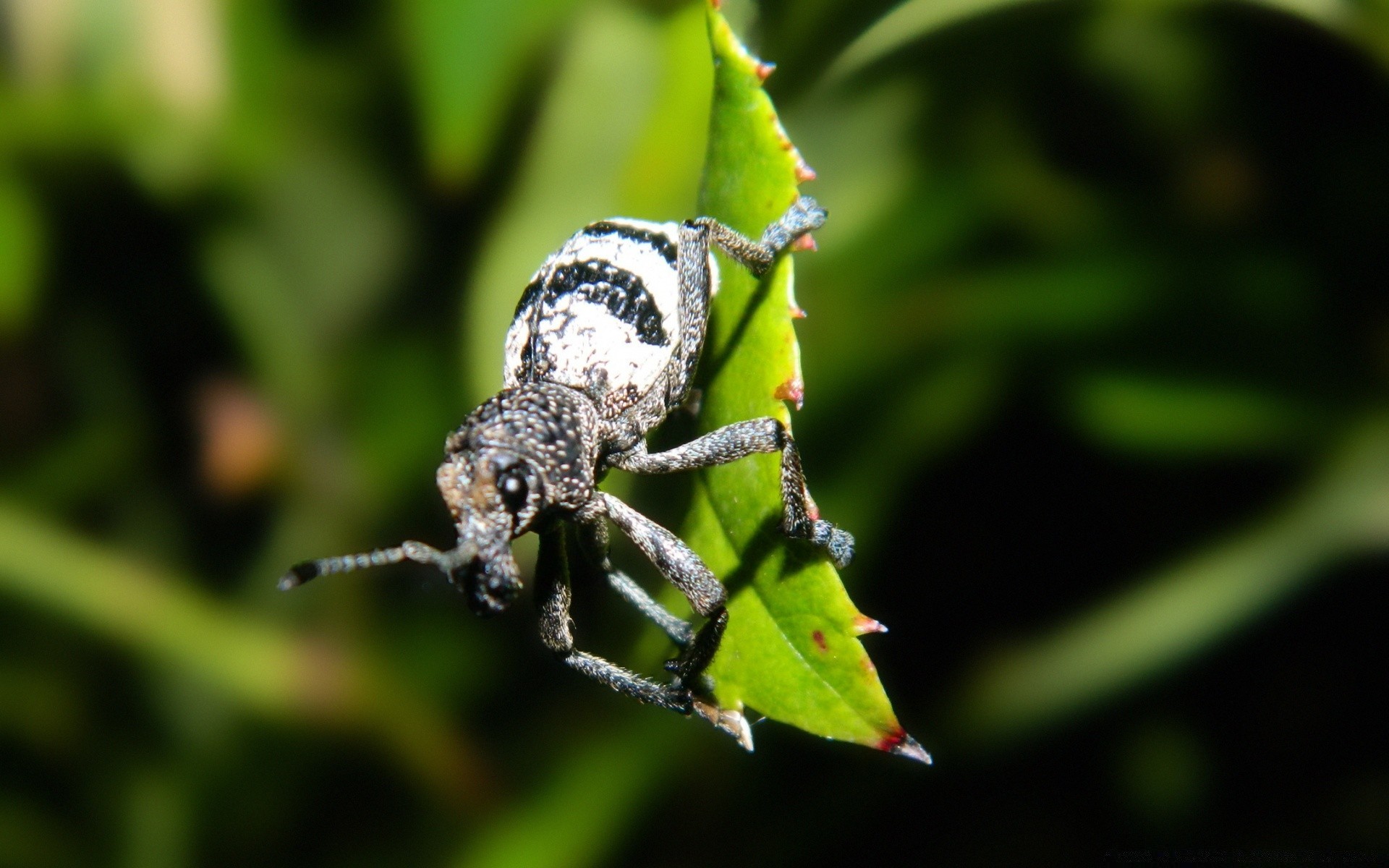 Ein Käfer sitzt in Regentropfen auf dem Rasen