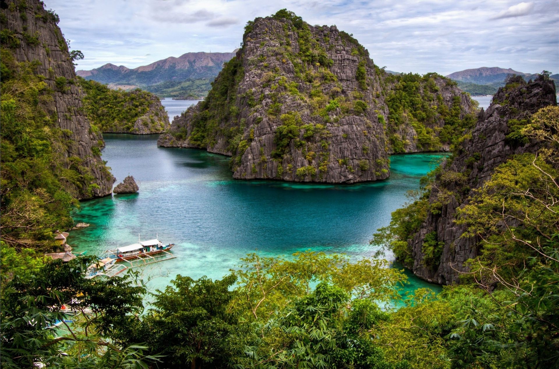 Blick auf die Berge und die Bucht mit der smaragdgrünen Farbe des Wassers