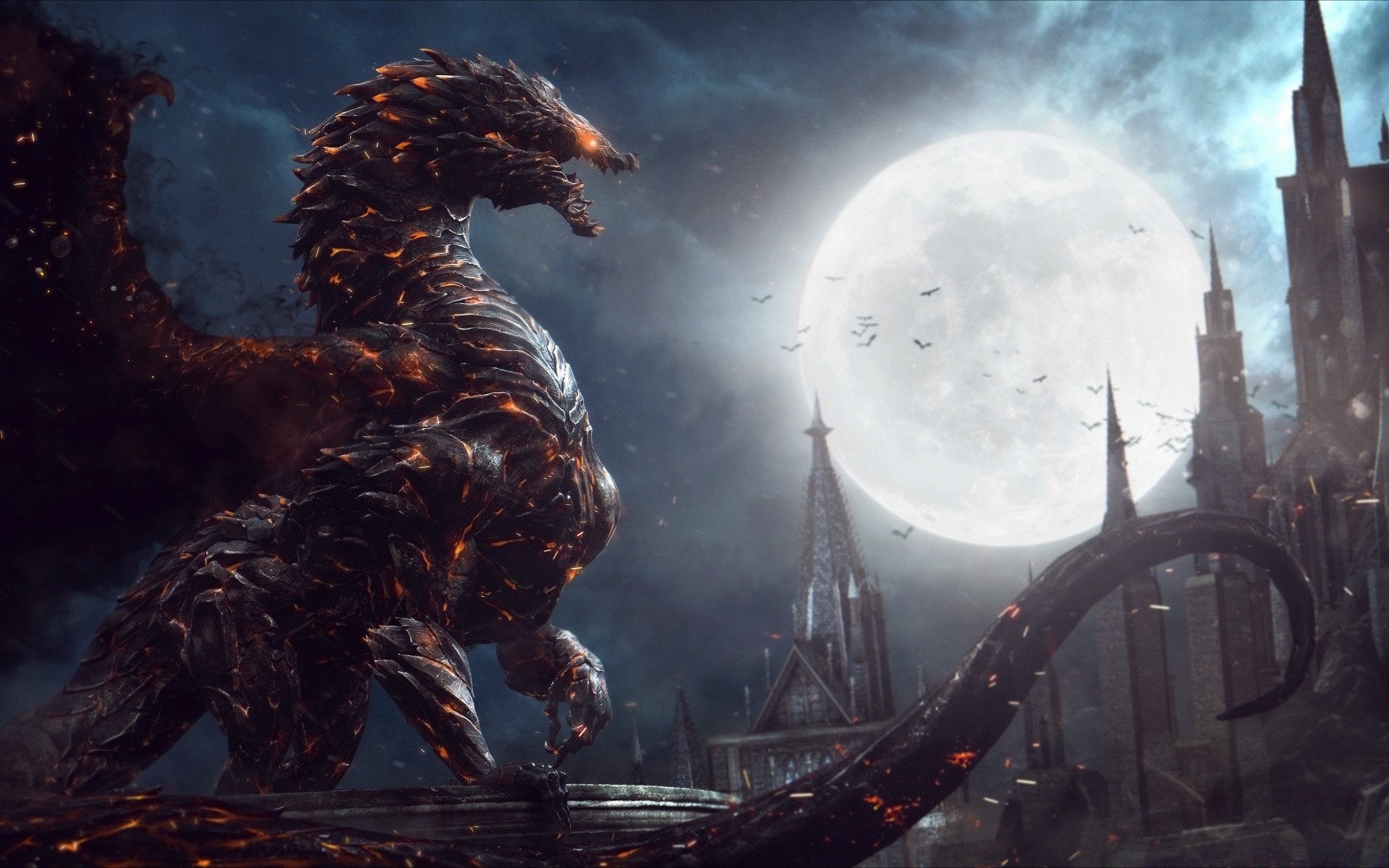 Drachen in der nähe des schlosses auf dem hintergrund des mondesDrachen in der Nähe des Schlosses auf dem Hintergrund des Mondes
