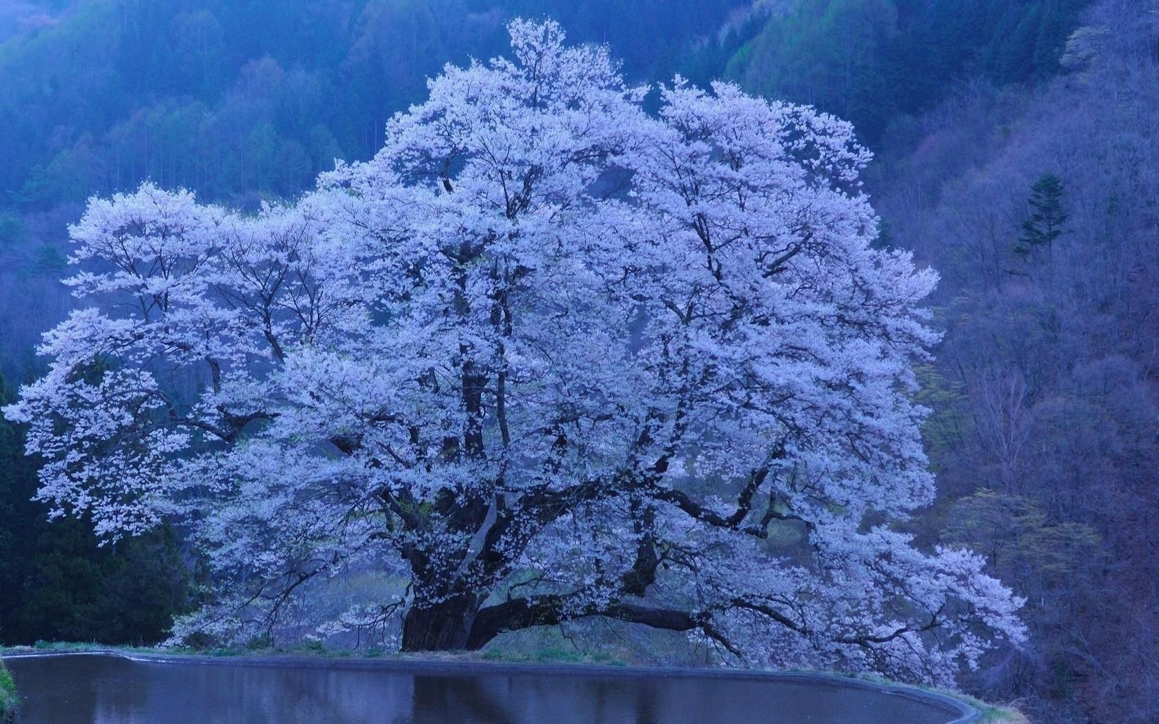Winterlandschaft. Ein weißer Baum am Ufer des Sees