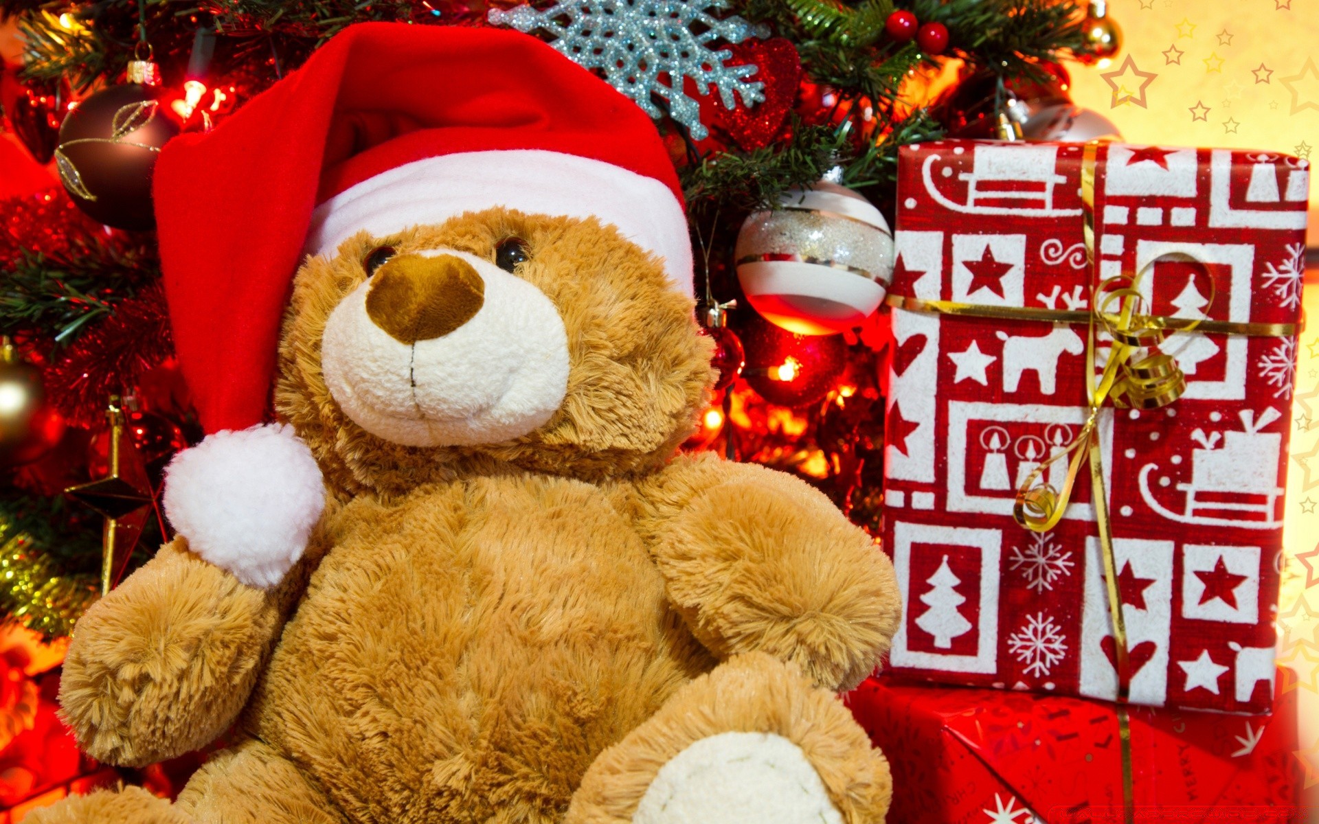 Teddybär in einer Weihnachtskappe auf dem Hintergrund eines Weihnachtsbaumes und eines Geschenks