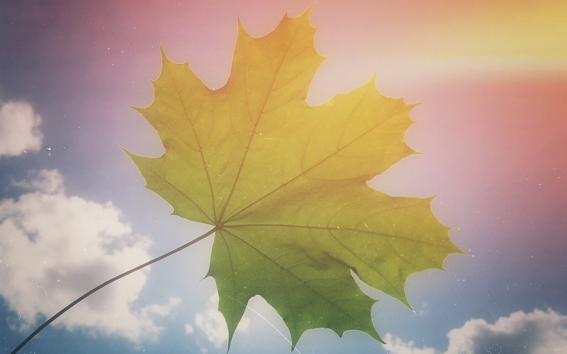 Gelbes Ahornblatt auf blauem Himmelshintergrund