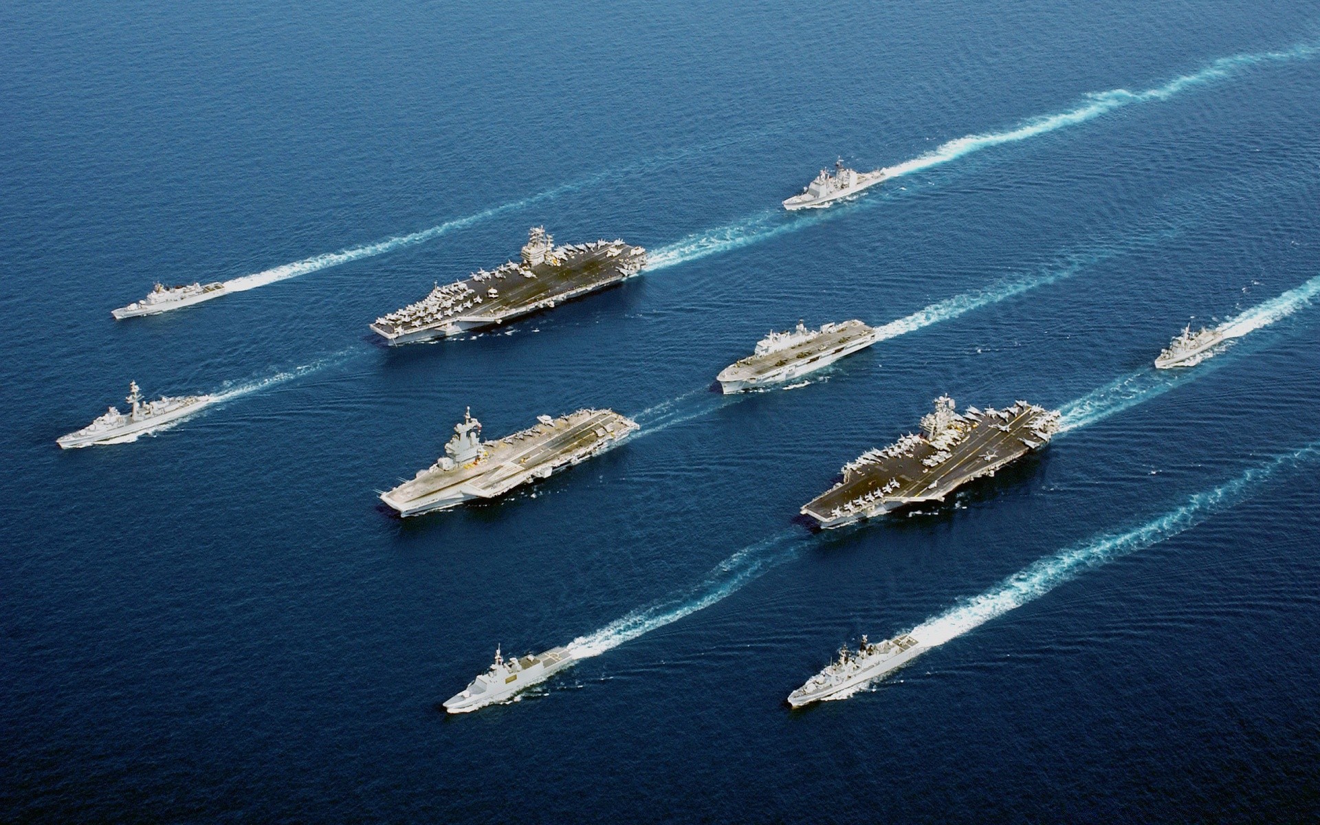 Flugzeugträger, begleitet von kleinen Kriegsschiffen