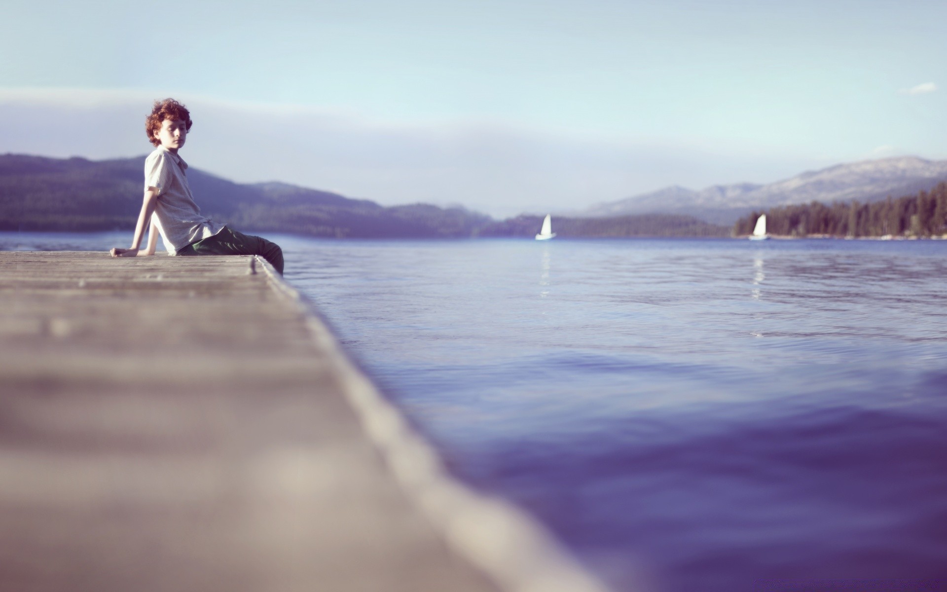 Ein einsamer Junge sitzt auf einem Liegeplatz