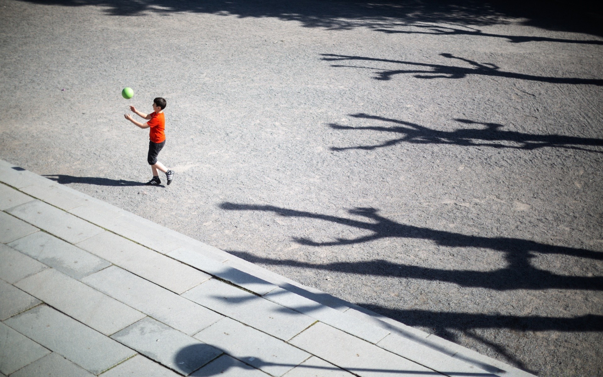 In der Verschwendung spielt der Junge den Ball, man sagt, spiel auf dem Planschbecken