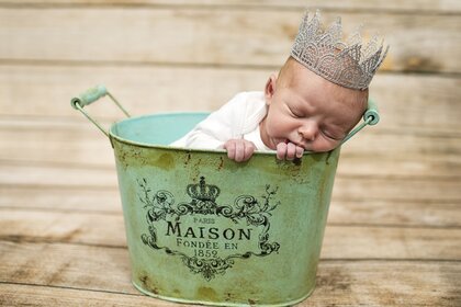 Ein Kind mit einer Krone auf dem Kopf sitzt in einem Eimer