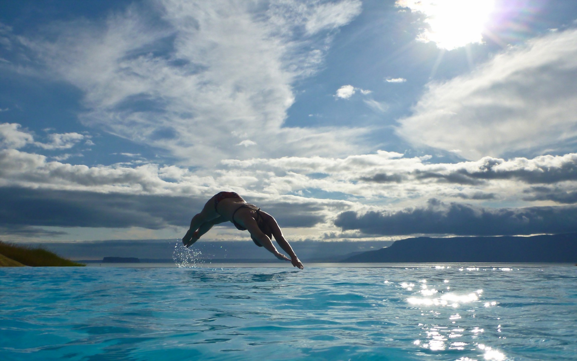 Das Mädchen taucht im Wasser nicht schlechter als ein Delphin