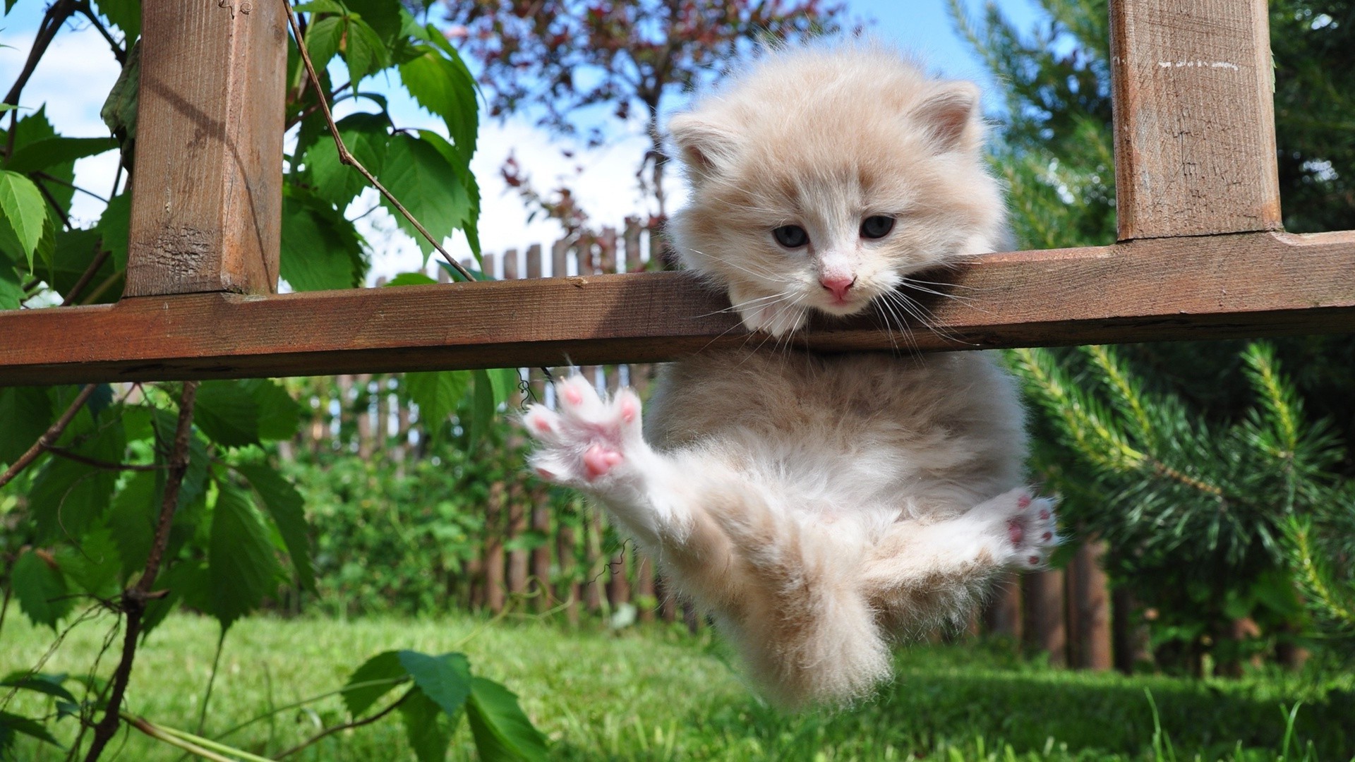 Ein süßes Kätzchen klettert auf einen Zaun. Schöne Kätzchen