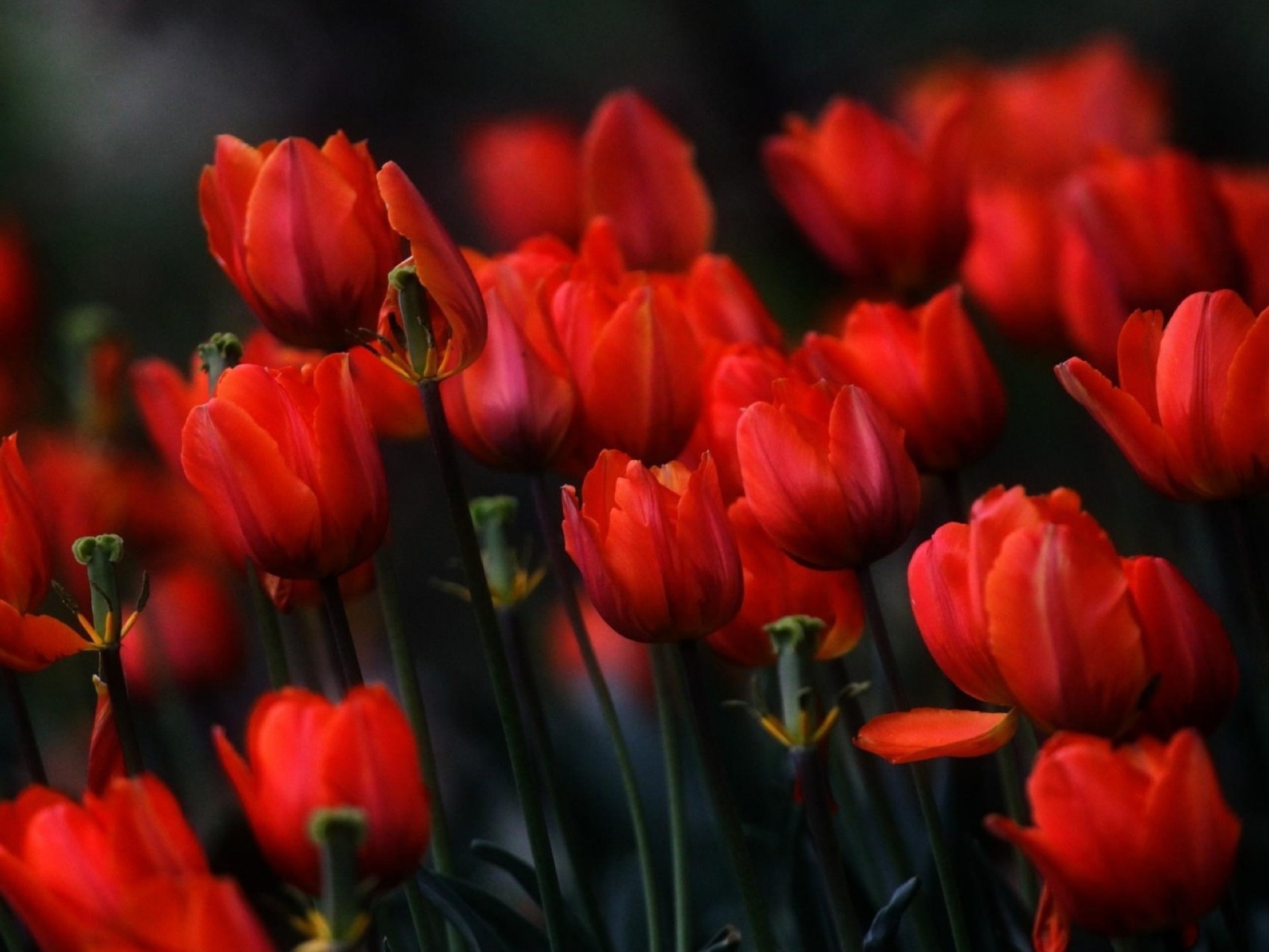 Knospen von scharlachroten Tulpen auf dunklem Hintergrund