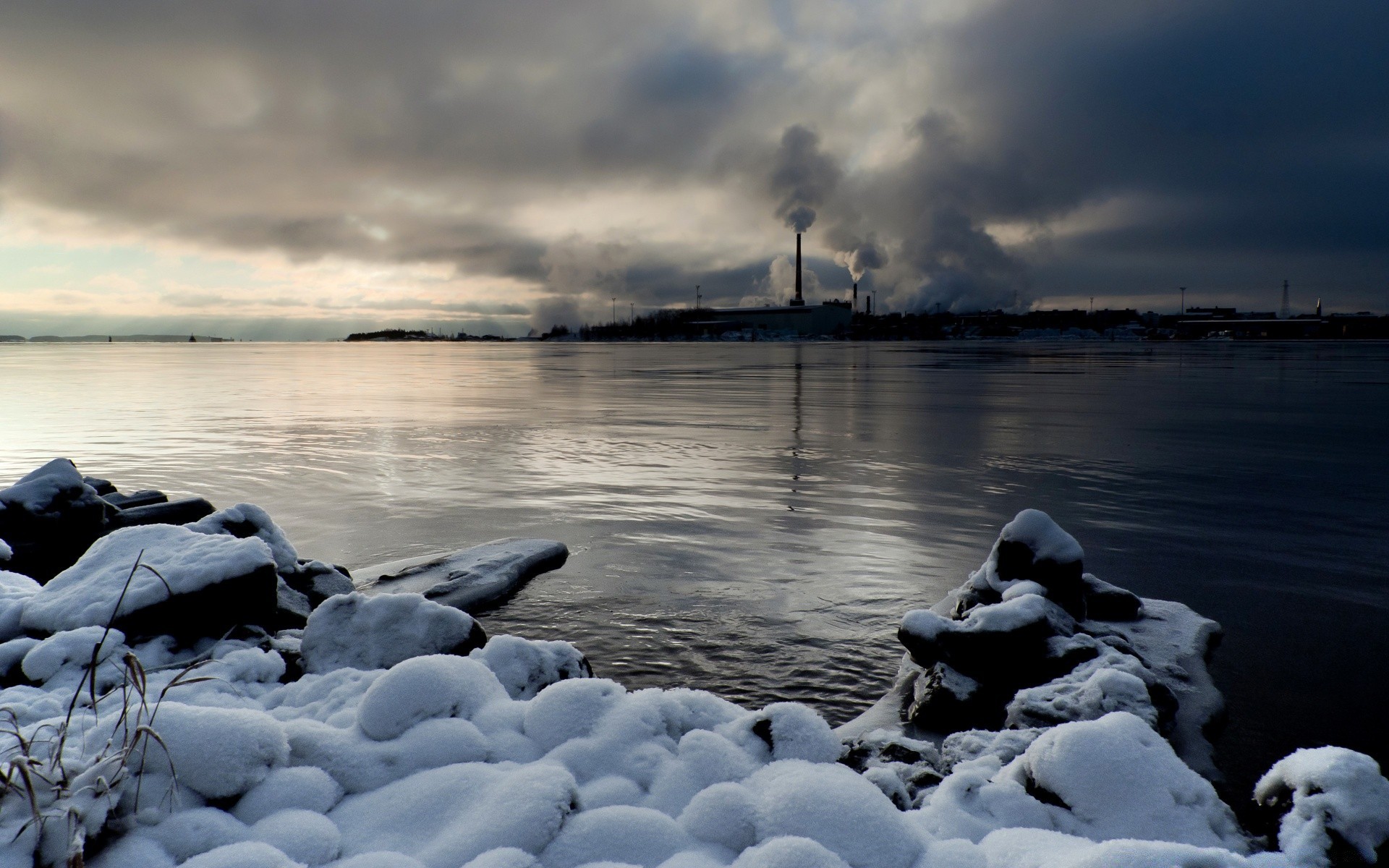 Kalte Landschaft des Sees und des Himmels