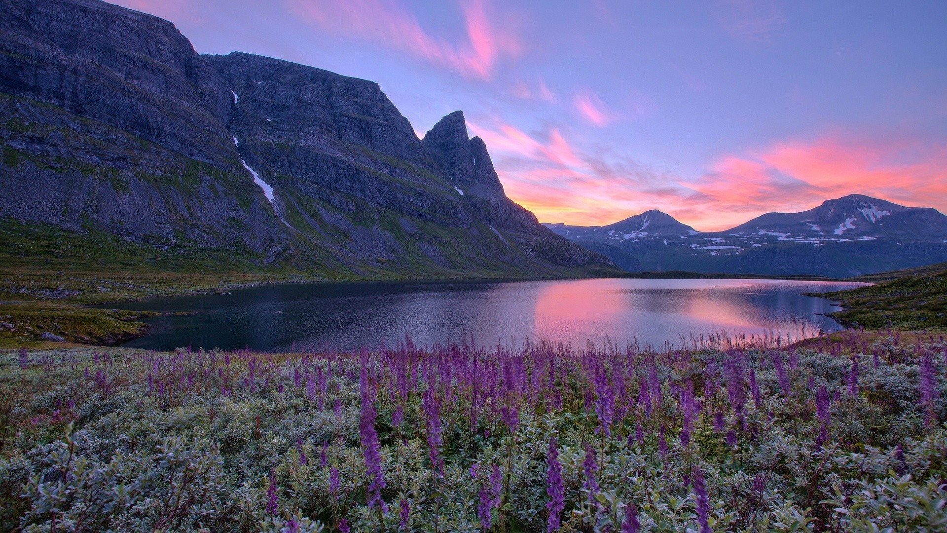 Eine Landschaft aus Blumen, Bergen und Wasser