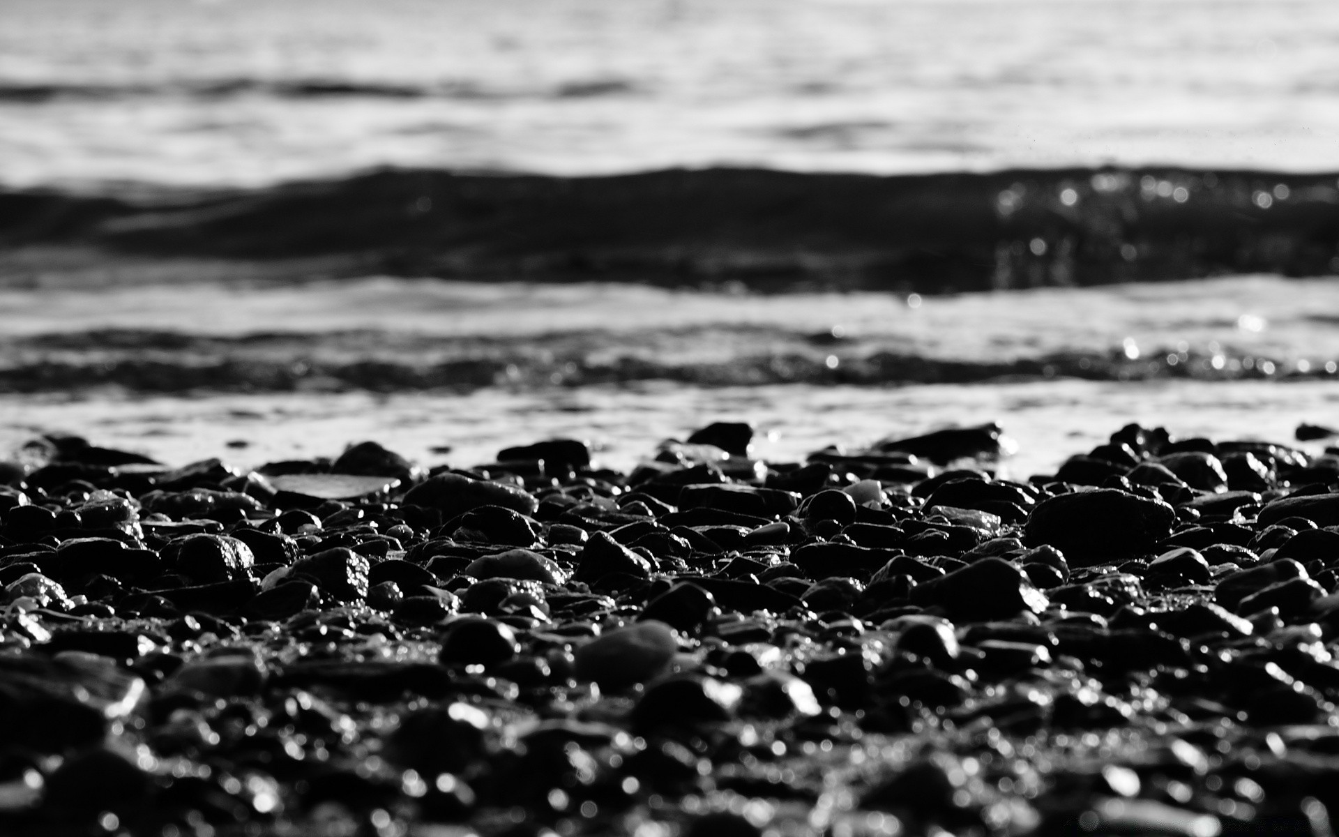 Kiesstrand und ruhige, schwarzweiße Landschaft