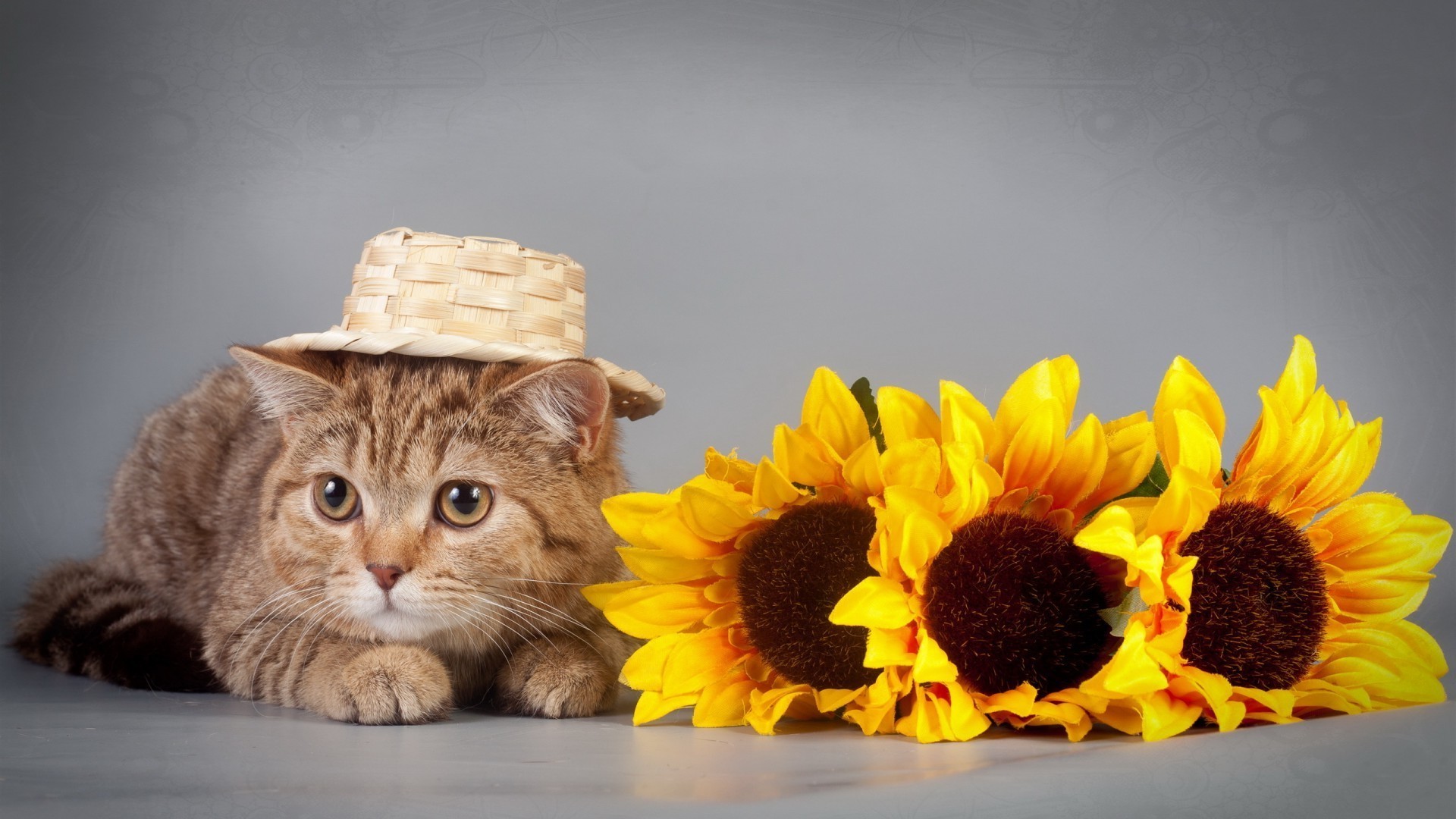 Ein Kätzchen mit einem Hut und schönen Blumen