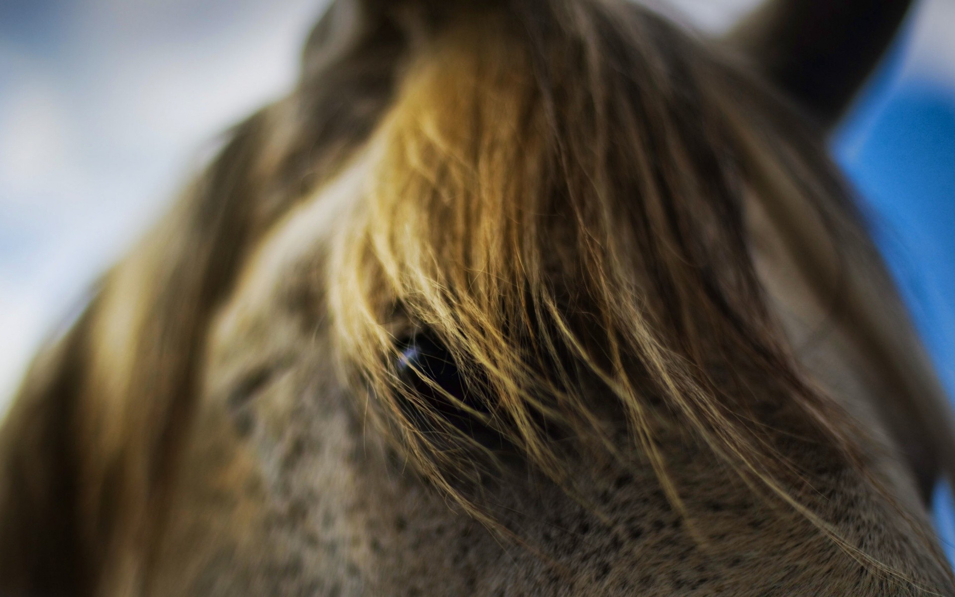 Ein Pferd mit weißen Hufen. Blauer, schöner Himmel