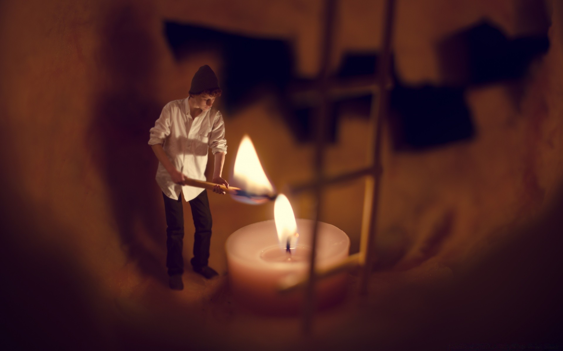 Ein Mann zündet ein Streichholz von einer riesigen Kerze an
