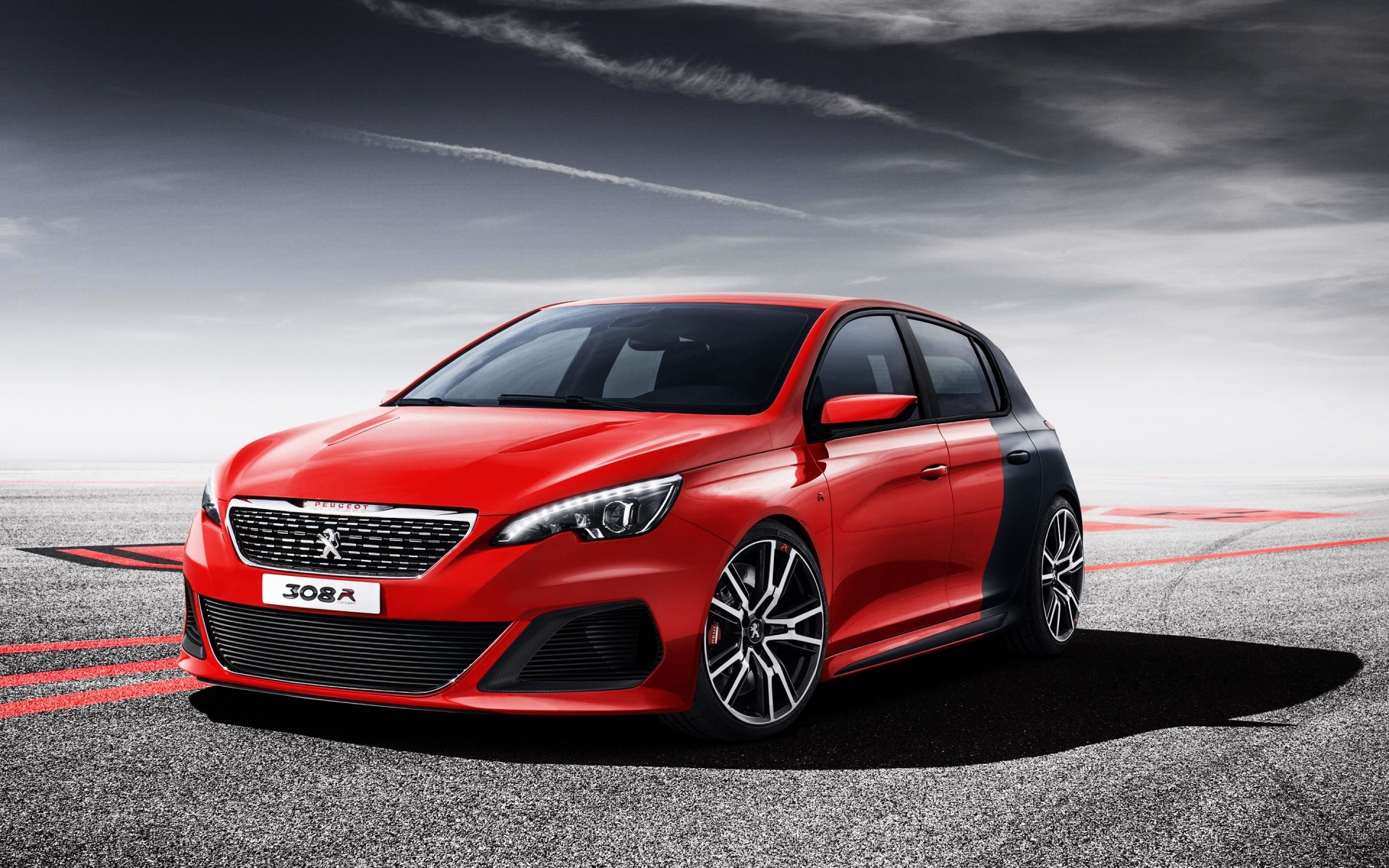 Ein rot-schwarzer Peugeot-Automobil auf der Straße
