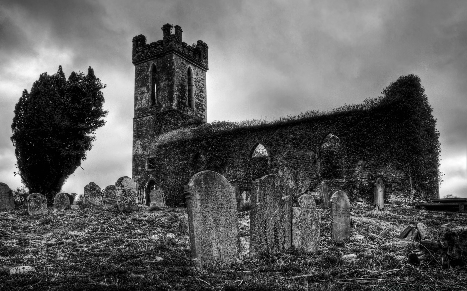 Altes Gebäude vor dem Hintergrund dunkler Wolken