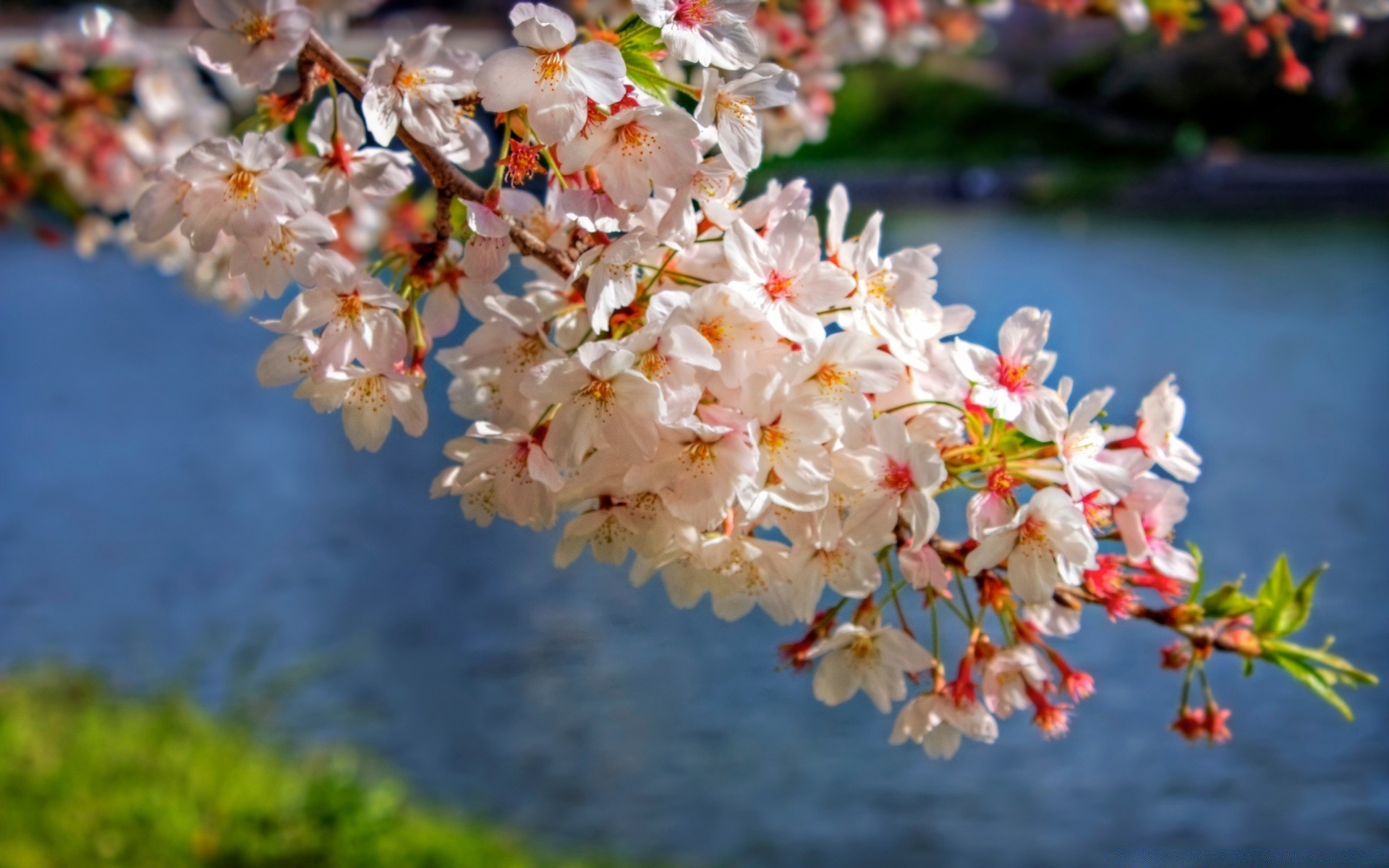 Ein Zweig mit weißen Blüten hängt über dem Wasser