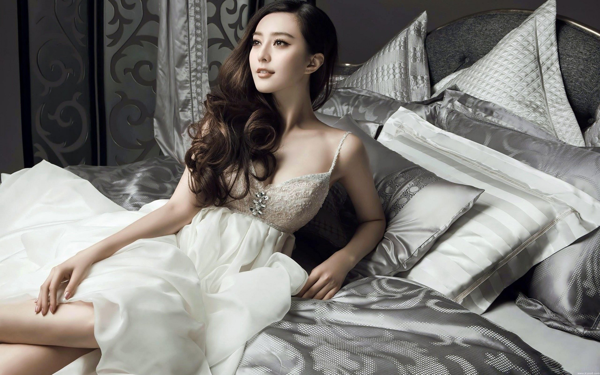 Asiatische Mädchen auf schneeweißer Bettwäsche