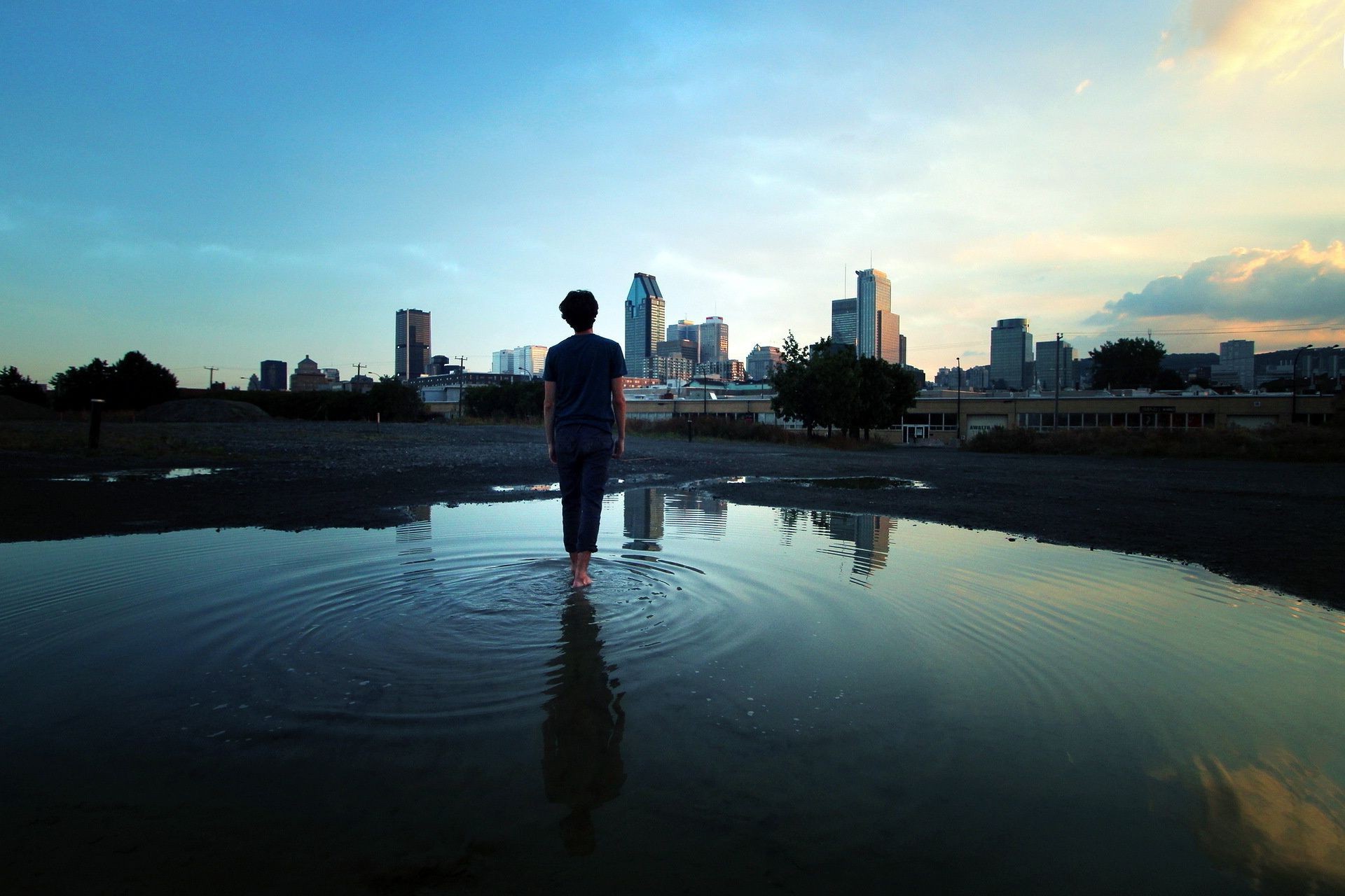 Die Promenade im Morgennebel. Ein Vogel sitzt auf einem Zaun