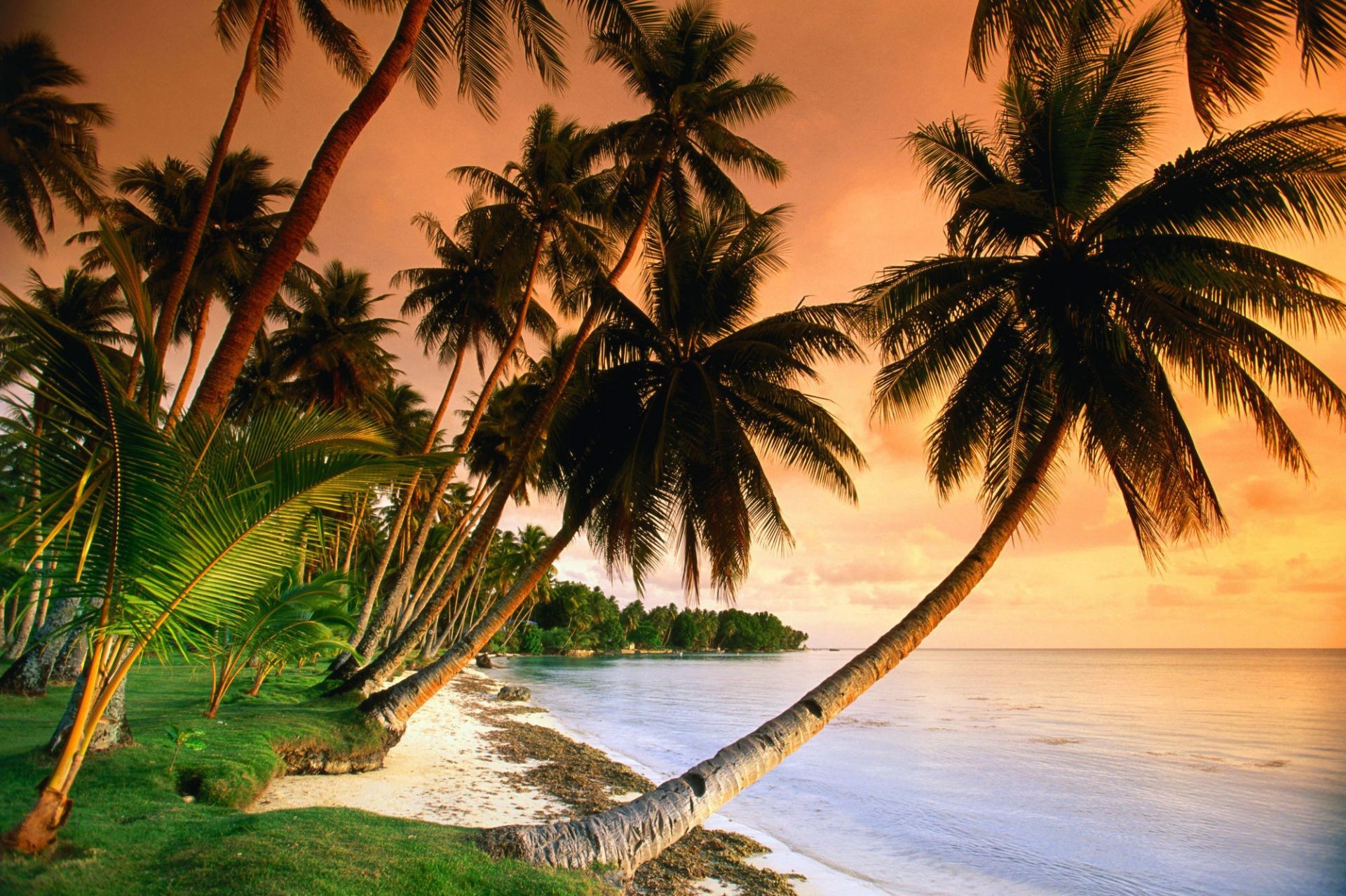 Palmen, Sonnenuntergang, weißer Sand und Meer in sanften Farben