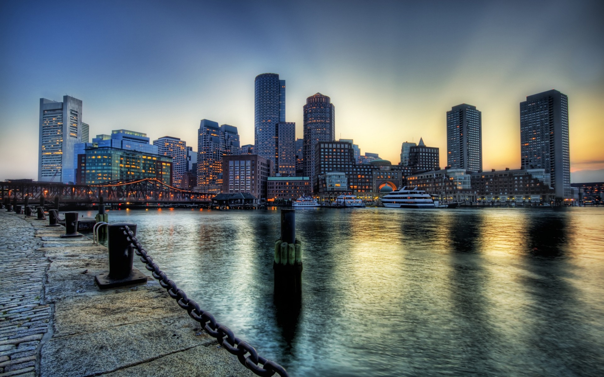 Schöne Landschaft von Wolkenkratzern über dem Fluss