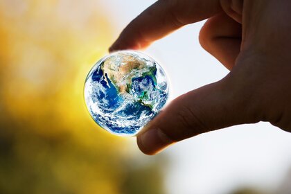 Die kugel des planeten auf der handfläche des universums, ein zerbrechliches gleichgewichtDie Kugel des Planeten auf der Handfläche des Universums, ein zerbrechliches Gleichgewicht